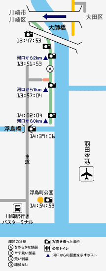 JR京浜東北線・東海道本線の鉄橋、京浜急行の鉄橋、新六郷橋を立て続けにくぐり、しばらく行くと舗装が悪くなり、大師橋が近づいてくるので渡って大田区から川崎市川崎区に入る。